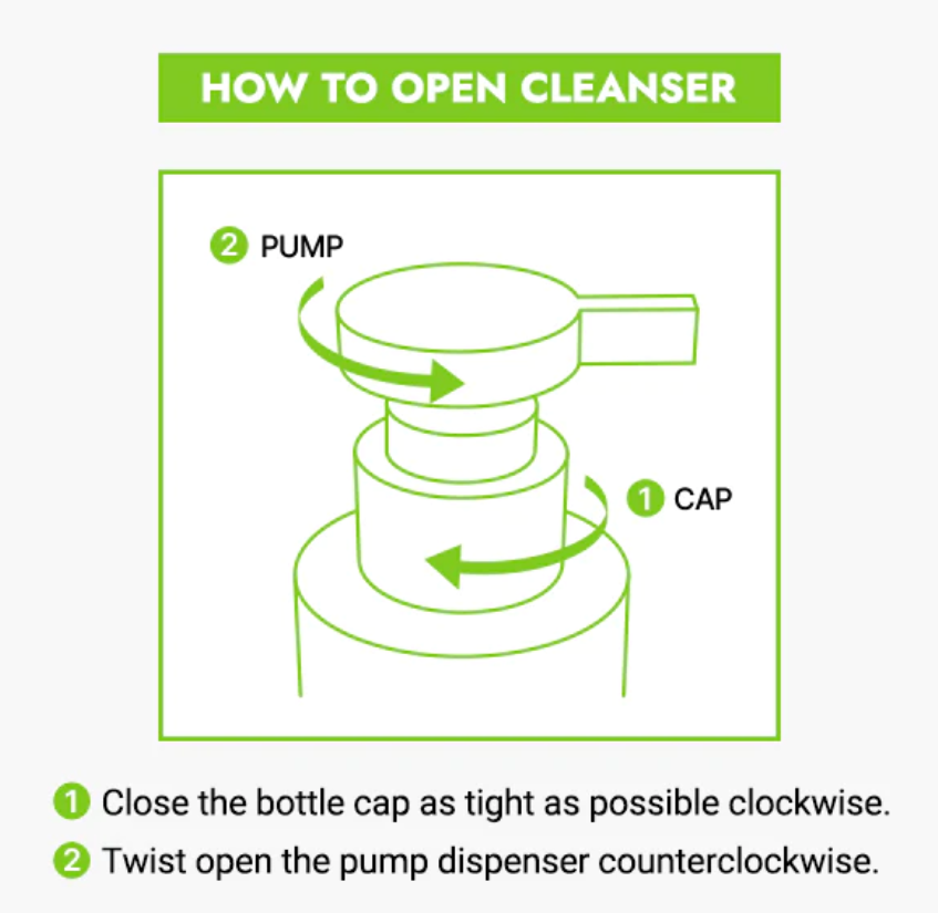 ضعي مضخة واحدة على الأيدي المبللة. يُرغى جيدًا ثم يُدلك بلطف على الوجه المبلل بالرغوة. ثم اشطفيه جيداً بالماء الفاتر.