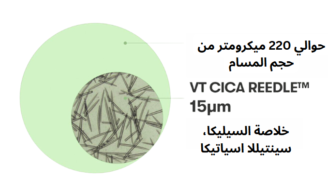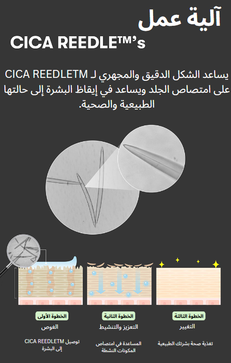 يشير مصطلح CICA REEDLETM إلى مكونات دقيقة الحجم ومستمدة من الطبيعة (من أصل معدني) للمساعدة في امتصاص الجلد. وهو أرق بمقدار 14 مرة من المسام. يحتوي CICA REEDLETM على نظام تقشير جلدي طبيعي يساعد في الامتصاص ويحفز الجلد برفق، مما يجعله ناعمًا وسلسًا.