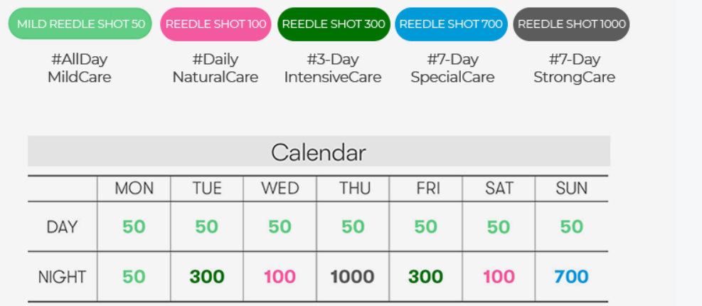 4) يمكن استخدام REEDLE SHOT 50 الخفيف مع منتجات ذات محتوى مختلف، ولكن لا تستخدمي REEDLE SHOT 100/300/700/1000 في نفس الوقت. يرجى الرجوع إلى [التقويم] أدناه عند استخدام المنتجات معًا.