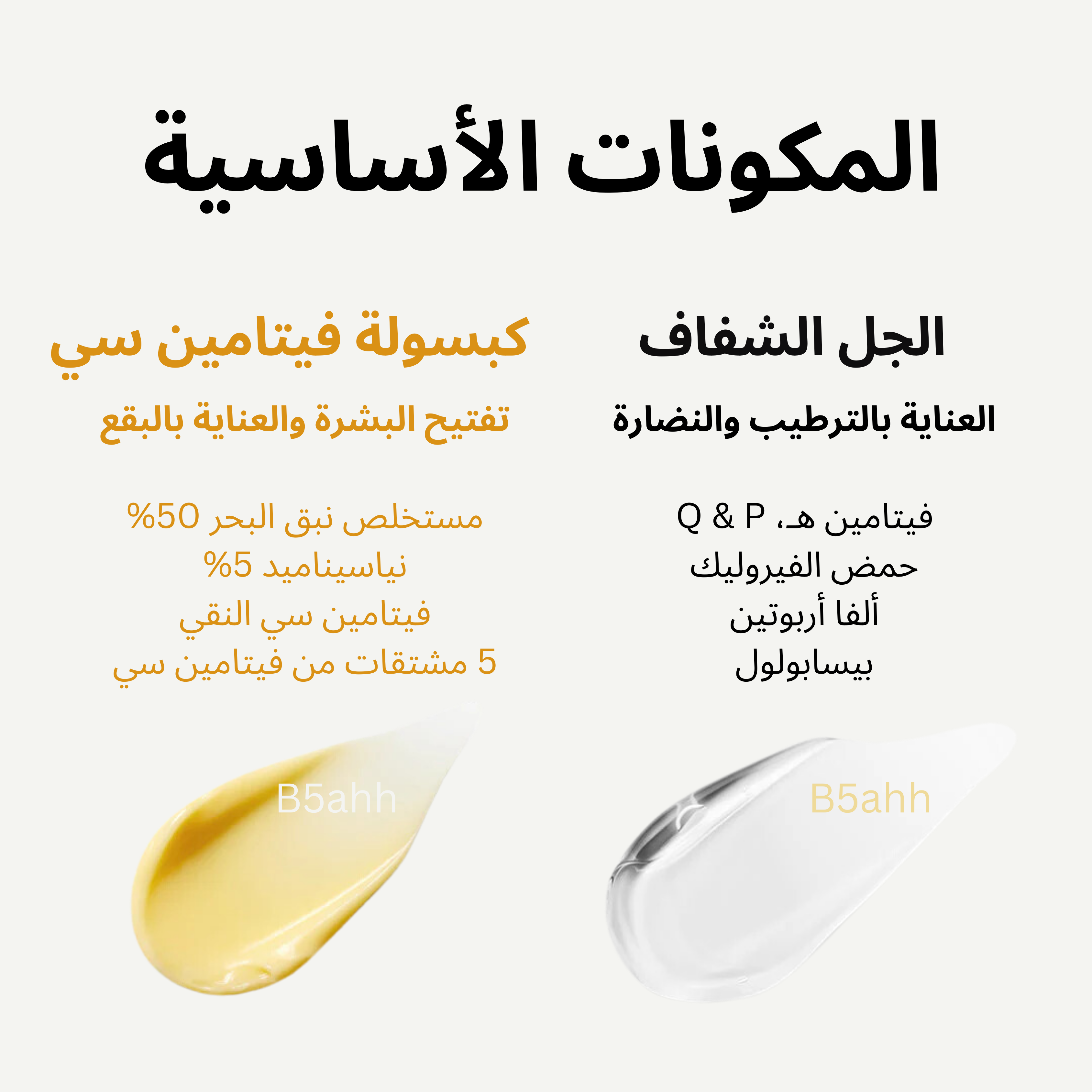 - 5 أنواع من مشتقات فيتامين C والنياسيناميد (5%): تعمل معًا لتقليل البقع الداكنة وتوحيد لون البشرة.